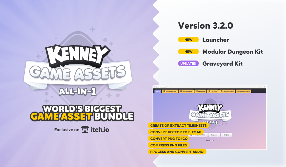 A new update for Kenney Game Assets All-in-1 has been released, you can download the update by clicking the link below or by launching the itch.io app. It's not recommended to overwrite previous versions, remove all older files first.