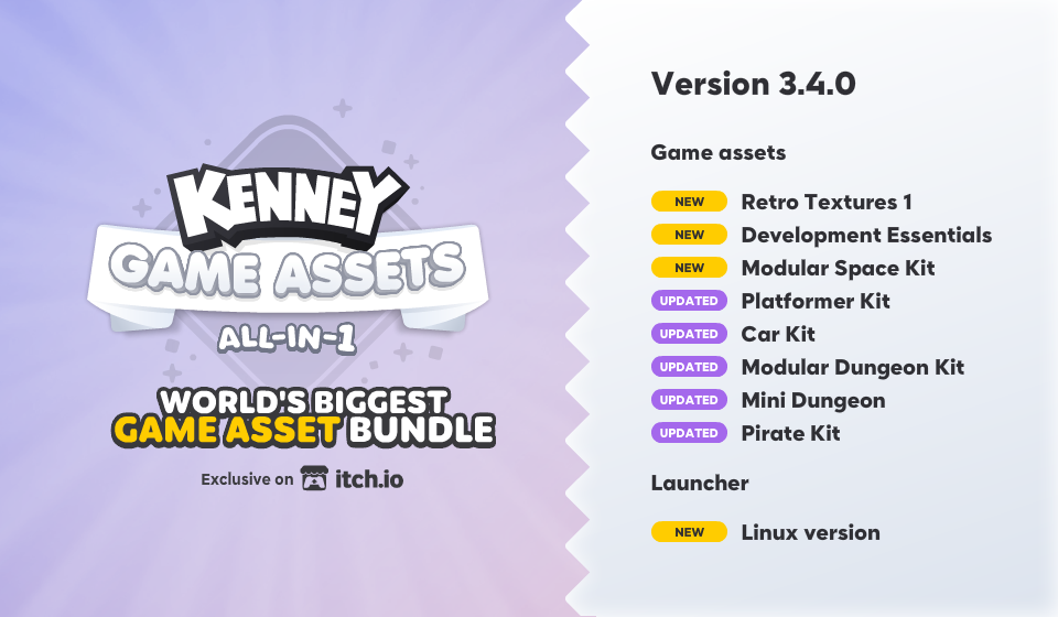 A new update for Kenney Game Assets All-in-1 (Launcher) has been released, you can download the update by clicking the link below or by launching the itch.io app. It's not recommended to overwrite previous versions, remove all older files first.